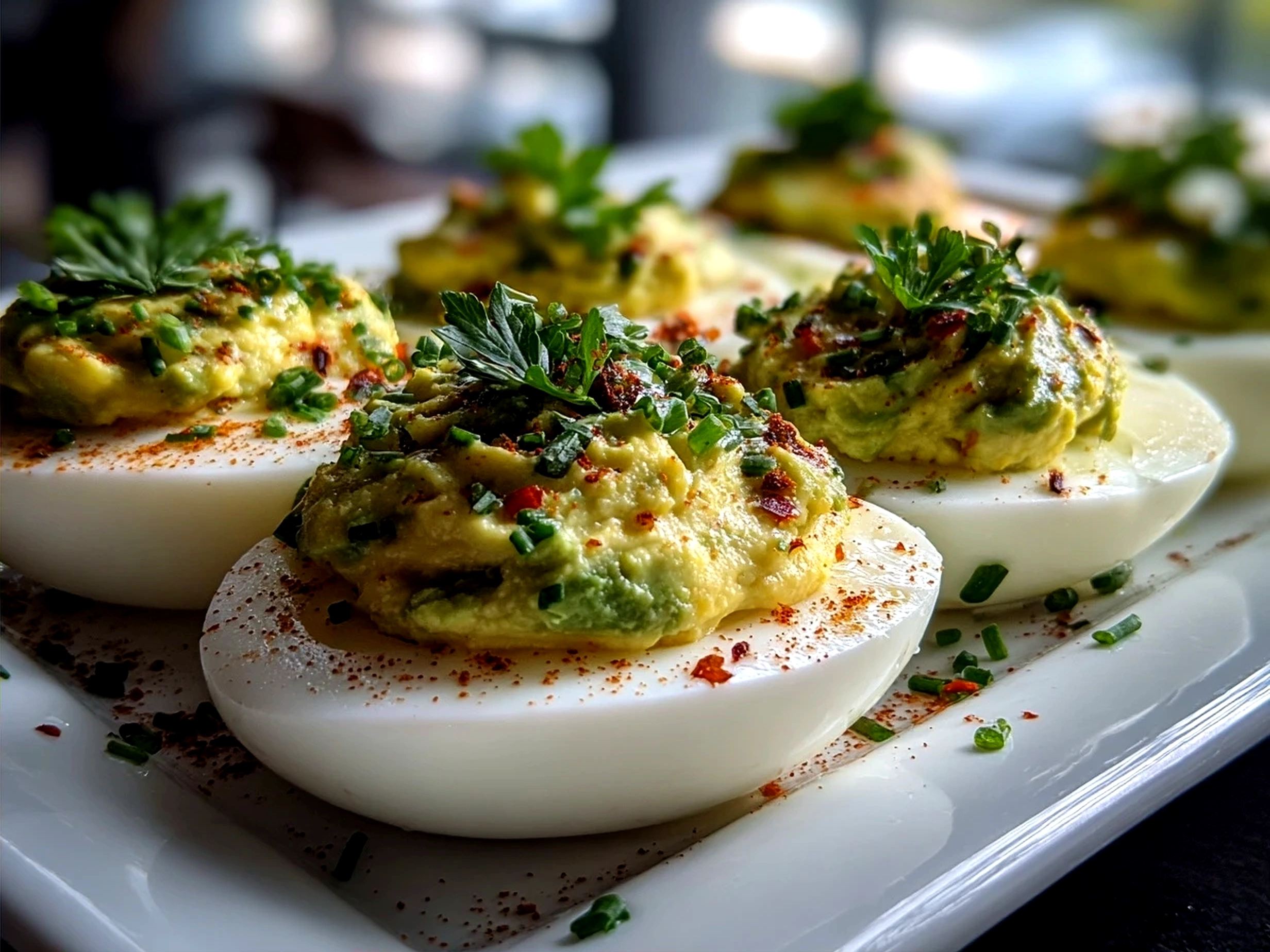 These avocado deviled eggs offer a creamy, nutritious twist on the classic appetizer, blending ripe avocado with tangy seasonings for a delicious, healthy snack.