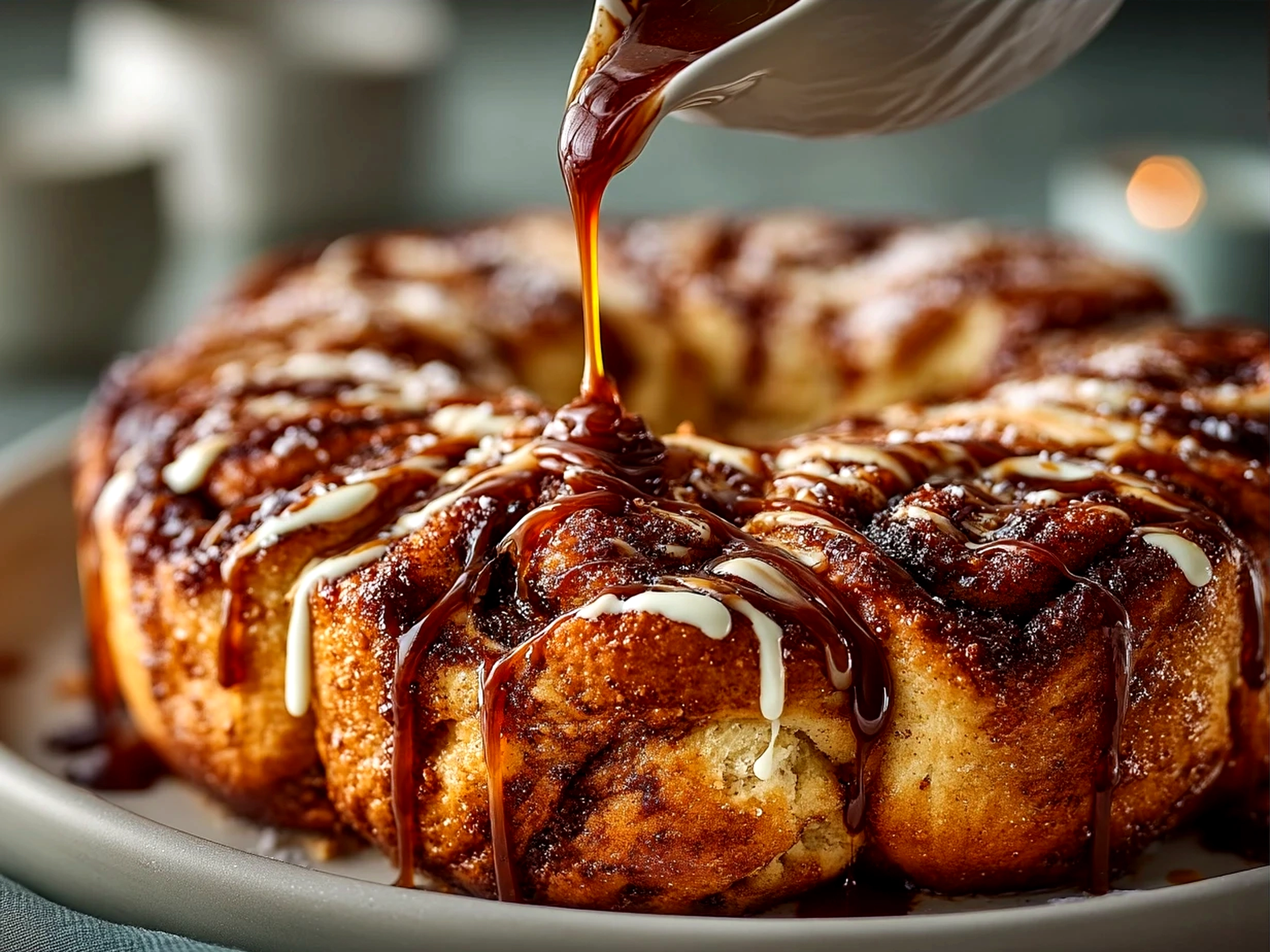 8. Drizzle your glaze over the top in a zigzag pattern. Use a spoon or a piping bag for neat lines. This finishing touch is what seals the deal on your Cinnamon Roll Pull-Apart Wreath.