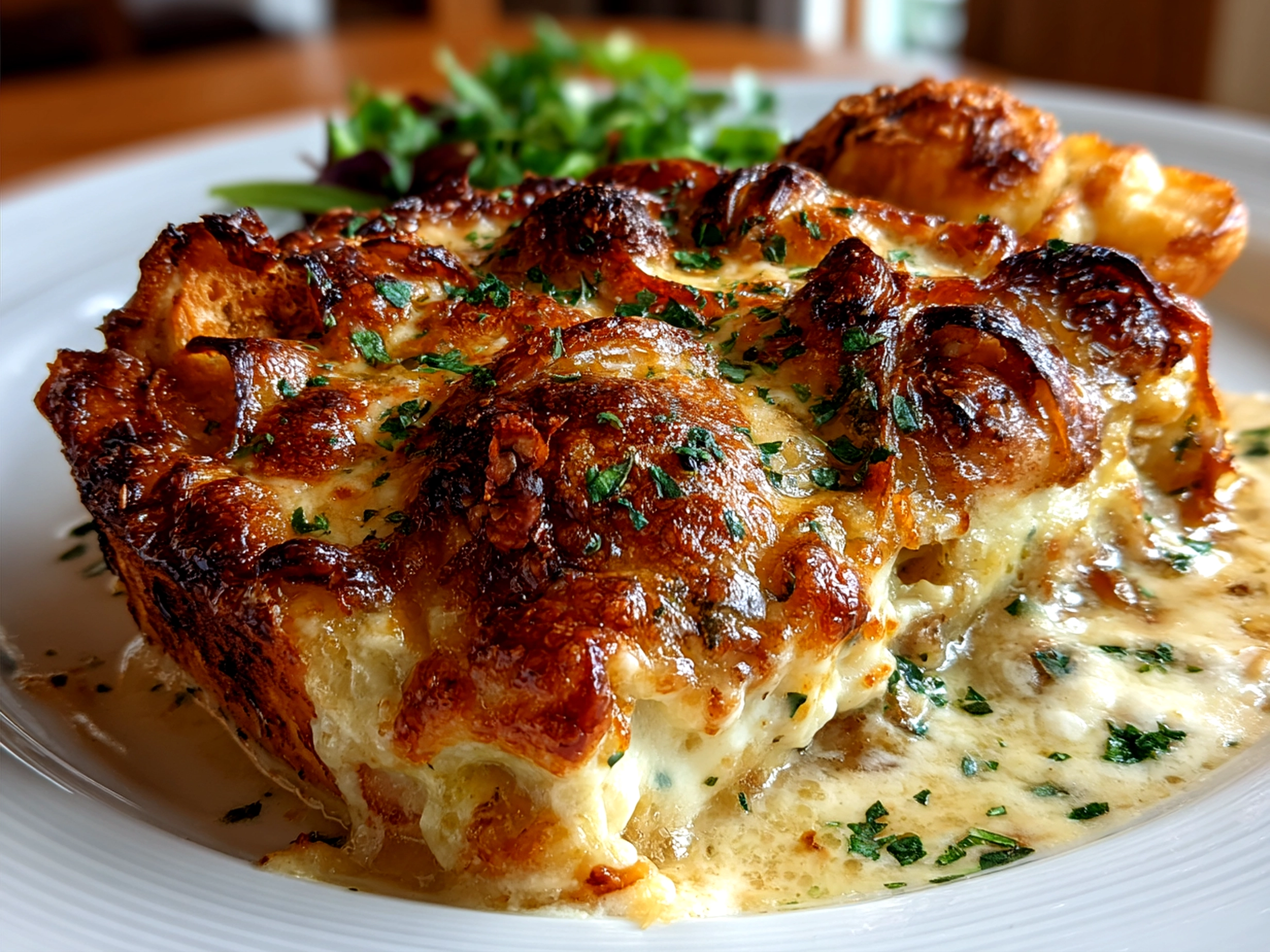 A savory French Onion Chicken Bake that combines tender chicken breasts with caramelized onions, rich Swiss cheese, and a crispy breadcrumb topping for a comforting and flavorful meal.