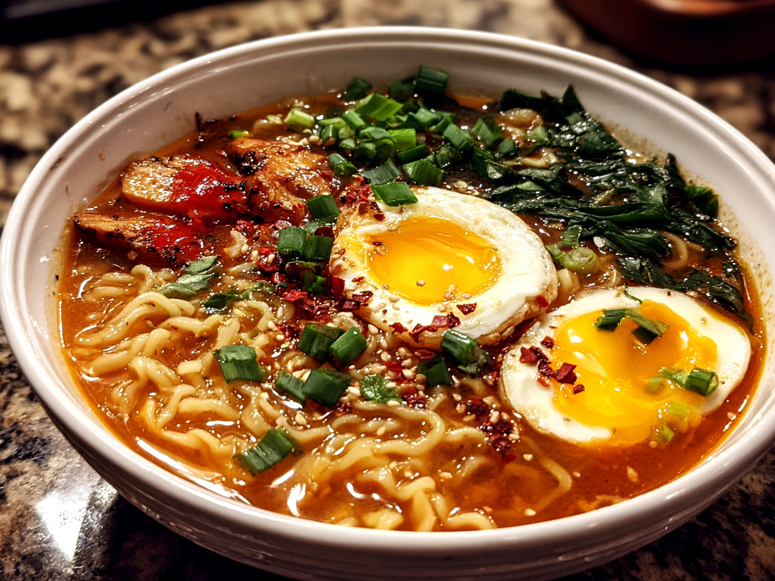 8. Top each bowl with a soft-boiled egg, green onions, and a sprinkle of toasted sesame seeds. If you want an extra kick, a drizzle of chili oil is my favorite finishing touch.