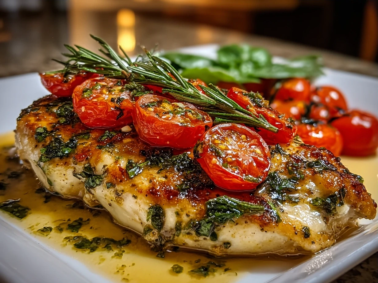 A flavorful and healthy baked chicken dish topped with fresh tomatoes and fragrant basil, perfect for a simple weeknight dinner.