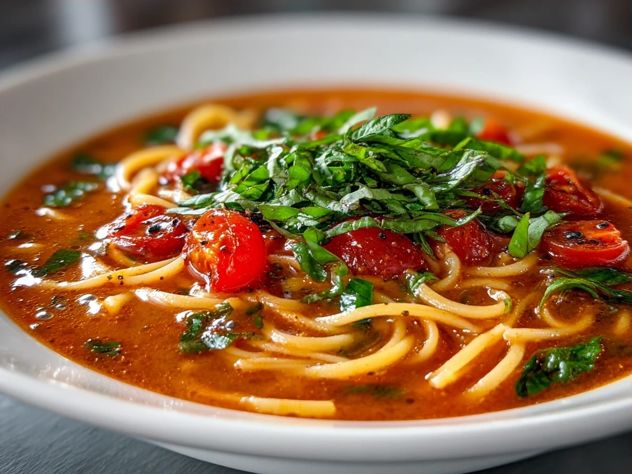 A comforting and fresh tomato basil noodle soup featuring bright tomatoes, fragrant basil, and tender noodles for a light yet satisfying meal.